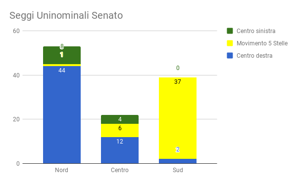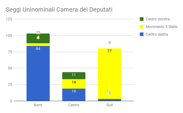 Nei due grafici qui sopra appare chiara la distribuzione dei seggi tra le varie zone d’Italia. I dati si riferiscono alle “battaglie” nei collegi uninominali, che offrono un’idea più chiara della situazione del paese. Appare evidente il fallimento totale del centro sinistra nelle aree più depresse, non avendo conquistato nemmeno un seggio al Sud. Anche il centro destra se la passa male nel mezzogiorno, mentre stravince al Nord.